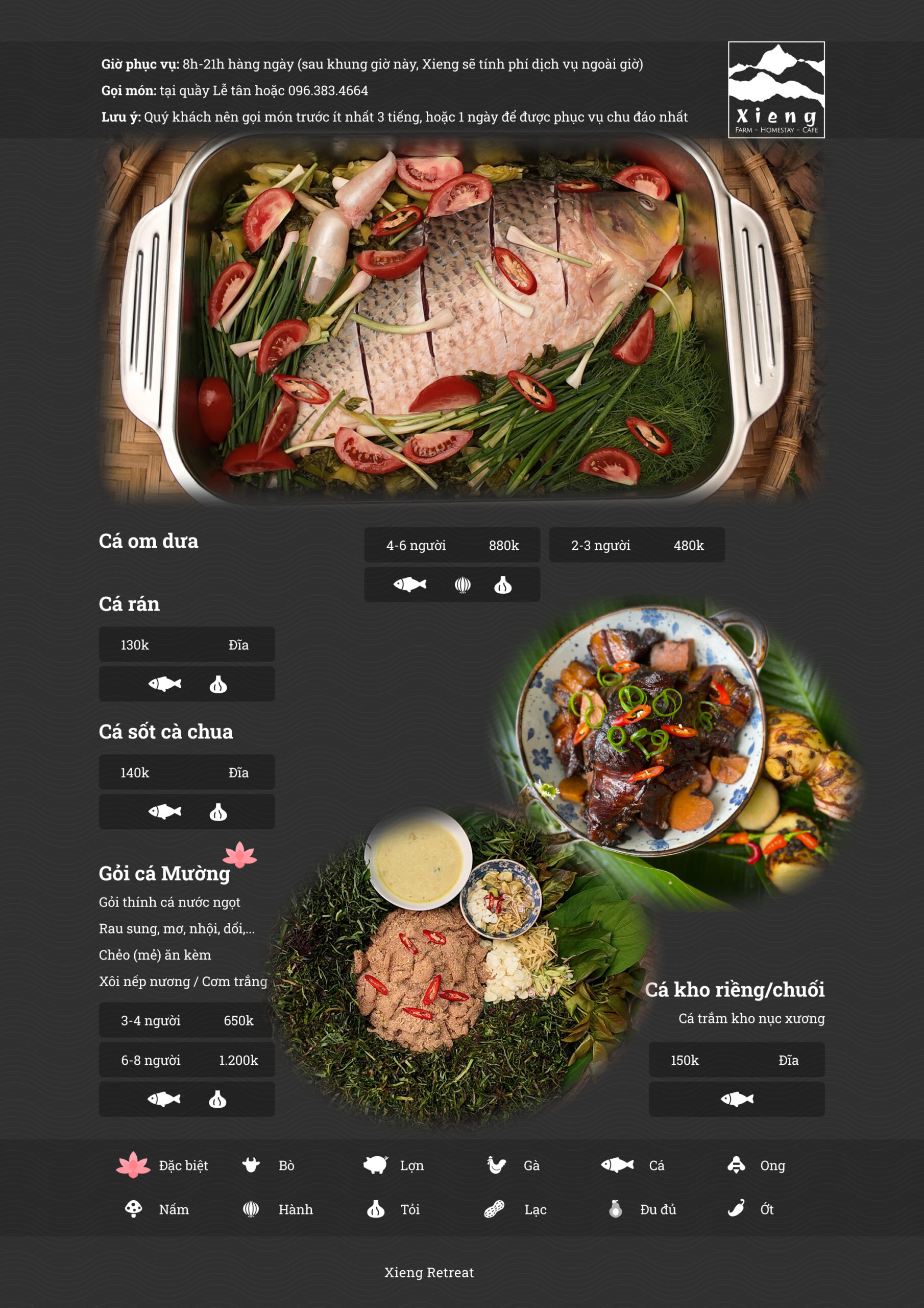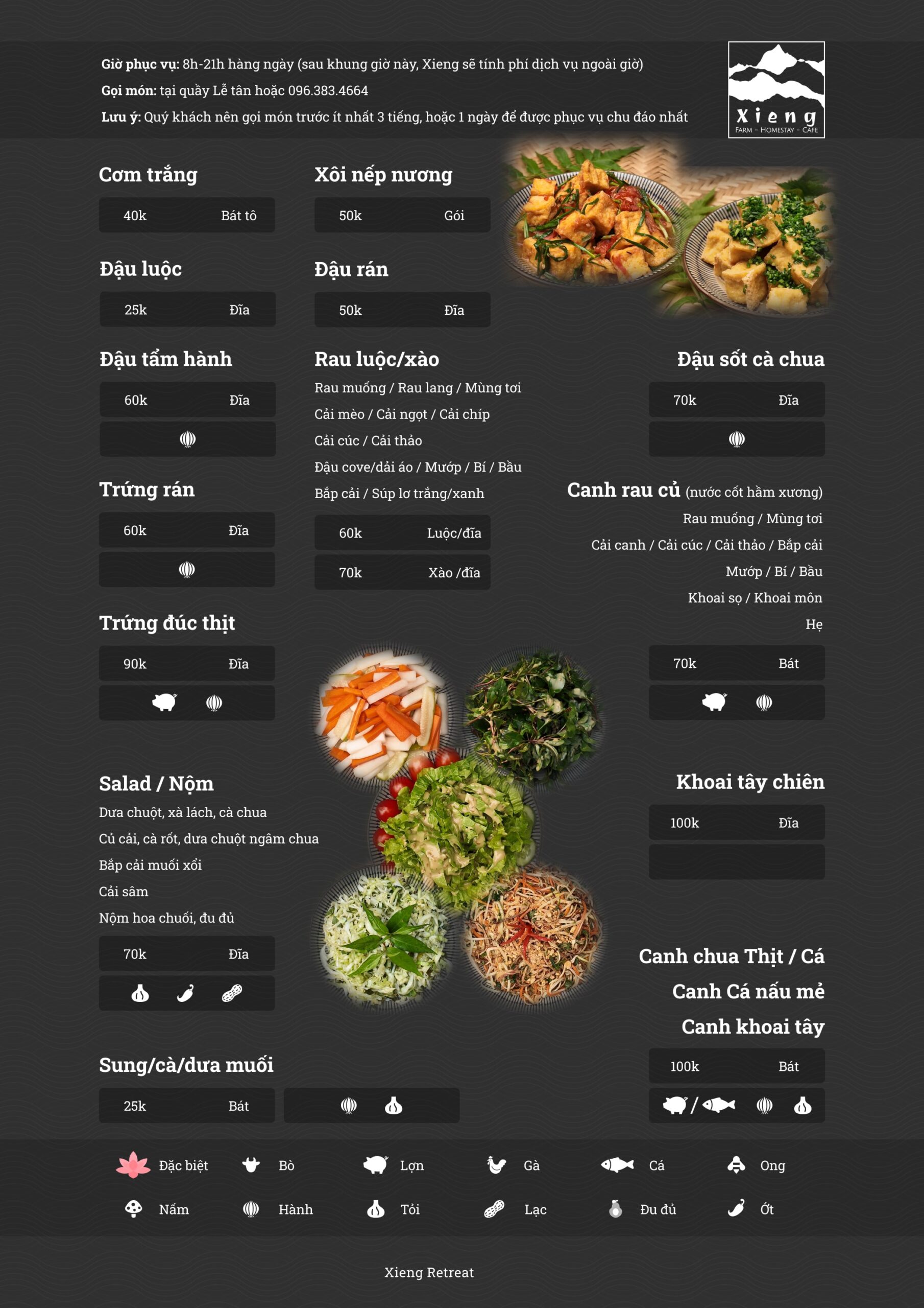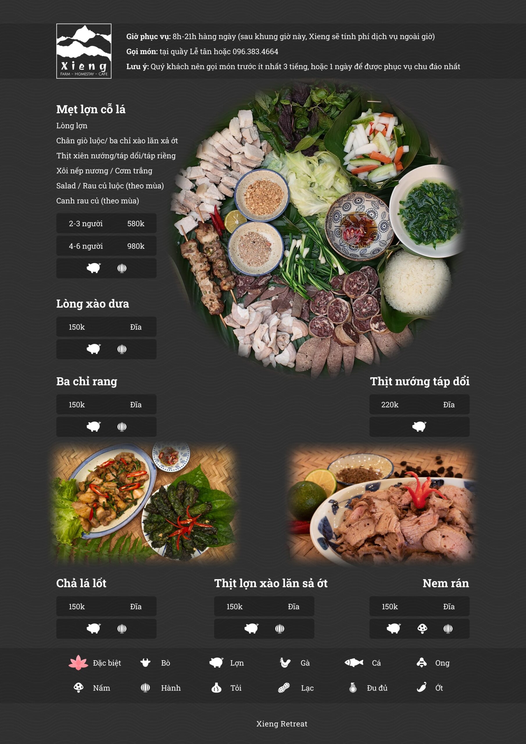 Xieng Retreat cung cấp các bữa ăn mang đậm bản sắc địa phương, với các hương vị đặc trưng dân tộc Mường, cùng một số món ăn phổ biến khác.